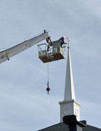 Our courageous Trustee Chairman, Ricky Baker, climbed aboard a large crane, was lifted up to the top of our steeple, and he removed the UMC flame from the cross. Everything went as planned, and the job was over in no time. Thank you, Ricky.